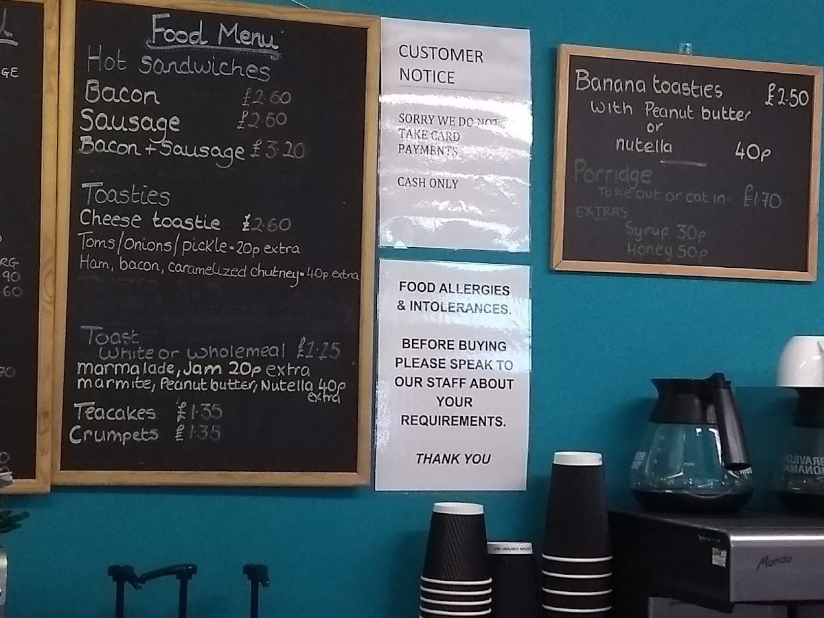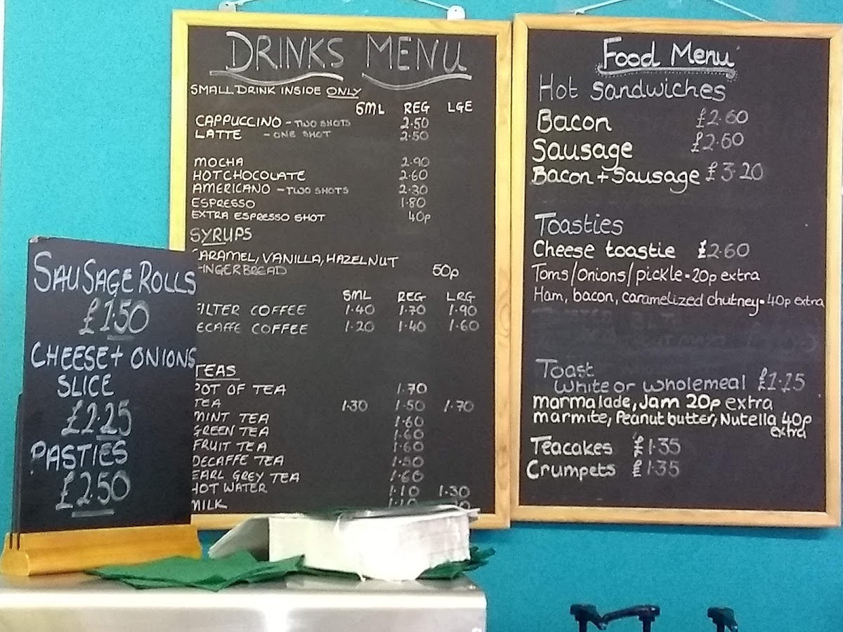 The menu offers a selection of hot sandwiches, toasties, hot beverages, teas, and light snacks suitable for breakfast, quick meals, or coffee breaks. It is designed to provide convenient options for visitors looking for a fast and simple dining experience.